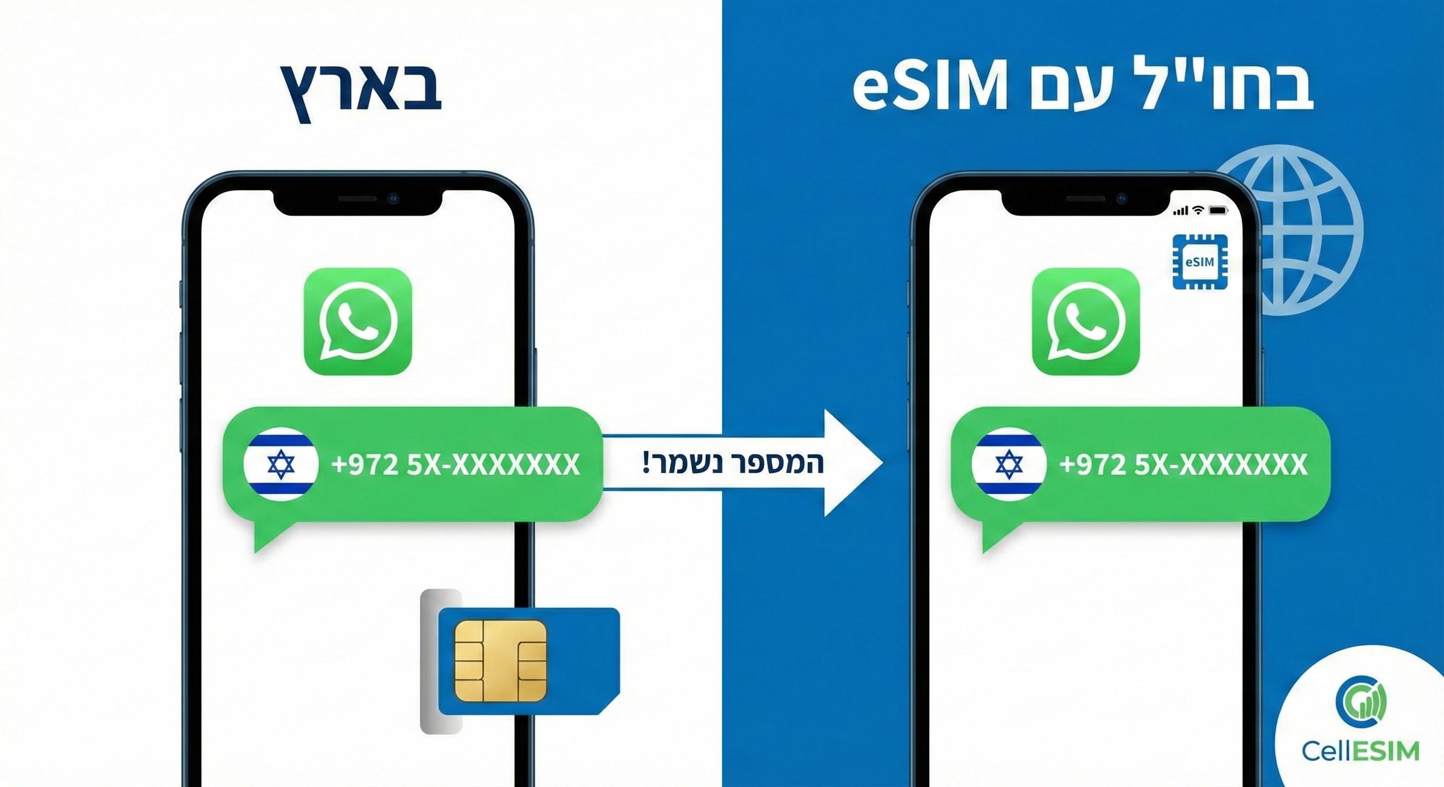 במדריך זה נעשה סדר ונלמד אתכם צעד אחר צעד איך להשתמש בטכנולוגיית ה-eSIM של CellESIM כדי לגלוש בזול, ובו זמנית לבצע שמירת מספר ישראלי (shmirat mispar yisraeli) כך שתישארו זמינים והוואטסאפ שלכם יישאר בדיוק כפי שהיה בארץ. המסר שלנו פשוט ומרגיע: המספר שלכם לא משתנה, רק האינטרנט שלכם הופך לזול יותר.